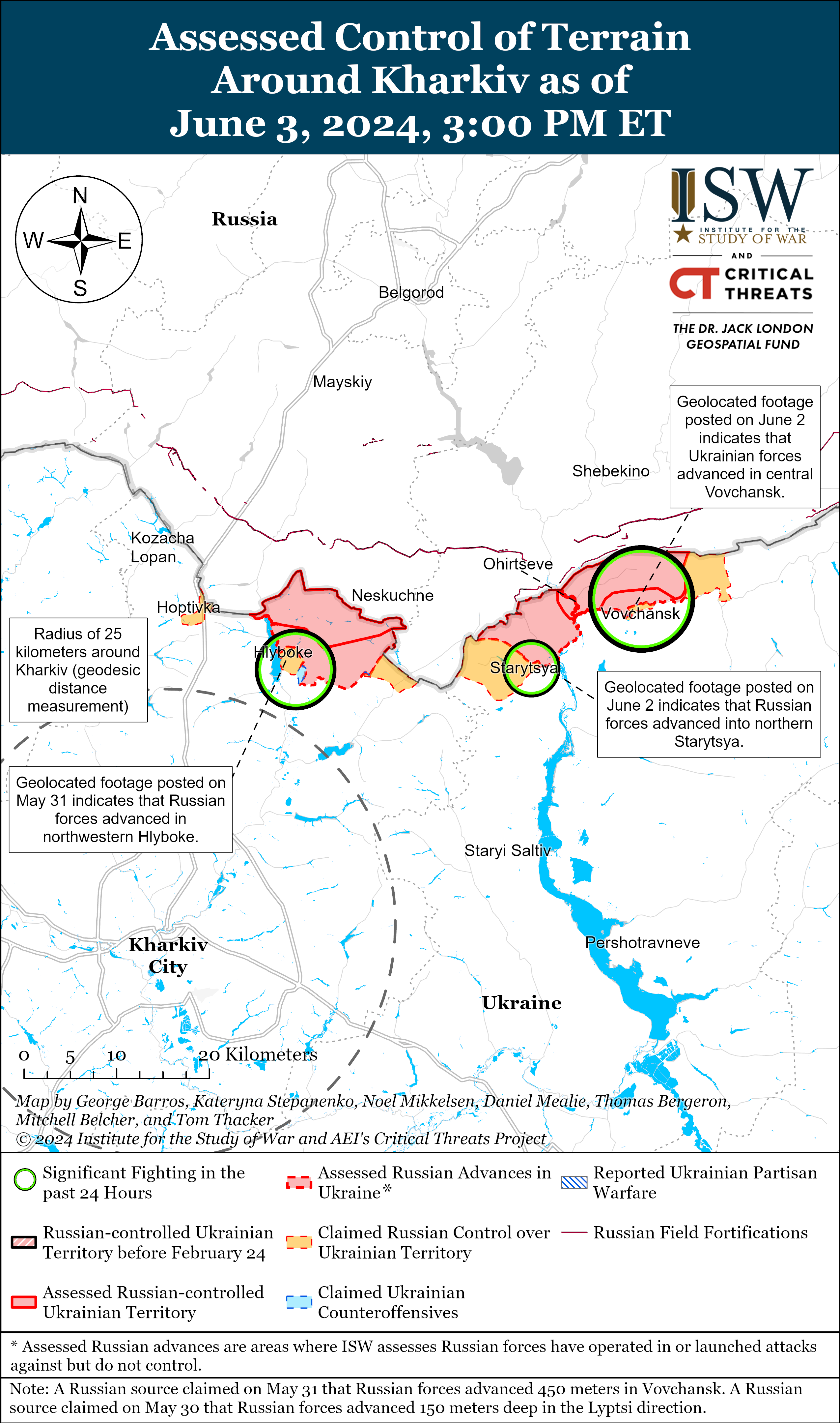 Сили оборони України повернули позиції у Вовчанську на північний схід від Харкова. Геолоковані кадри, опубліковані 2 червня, показують, що українські сили повернули позиції вздовж вулиці Духовної у центрі Вовчанська. Додаткові кадри з геолокацією, опубліковані 3 червня, показують, як російські та українські сили ведуть рукопашний бій уздовж вулиці Духовної, що дає змогу припустити, що Сили оборони України контратакують, щоб повернути контроль над позиціями.
