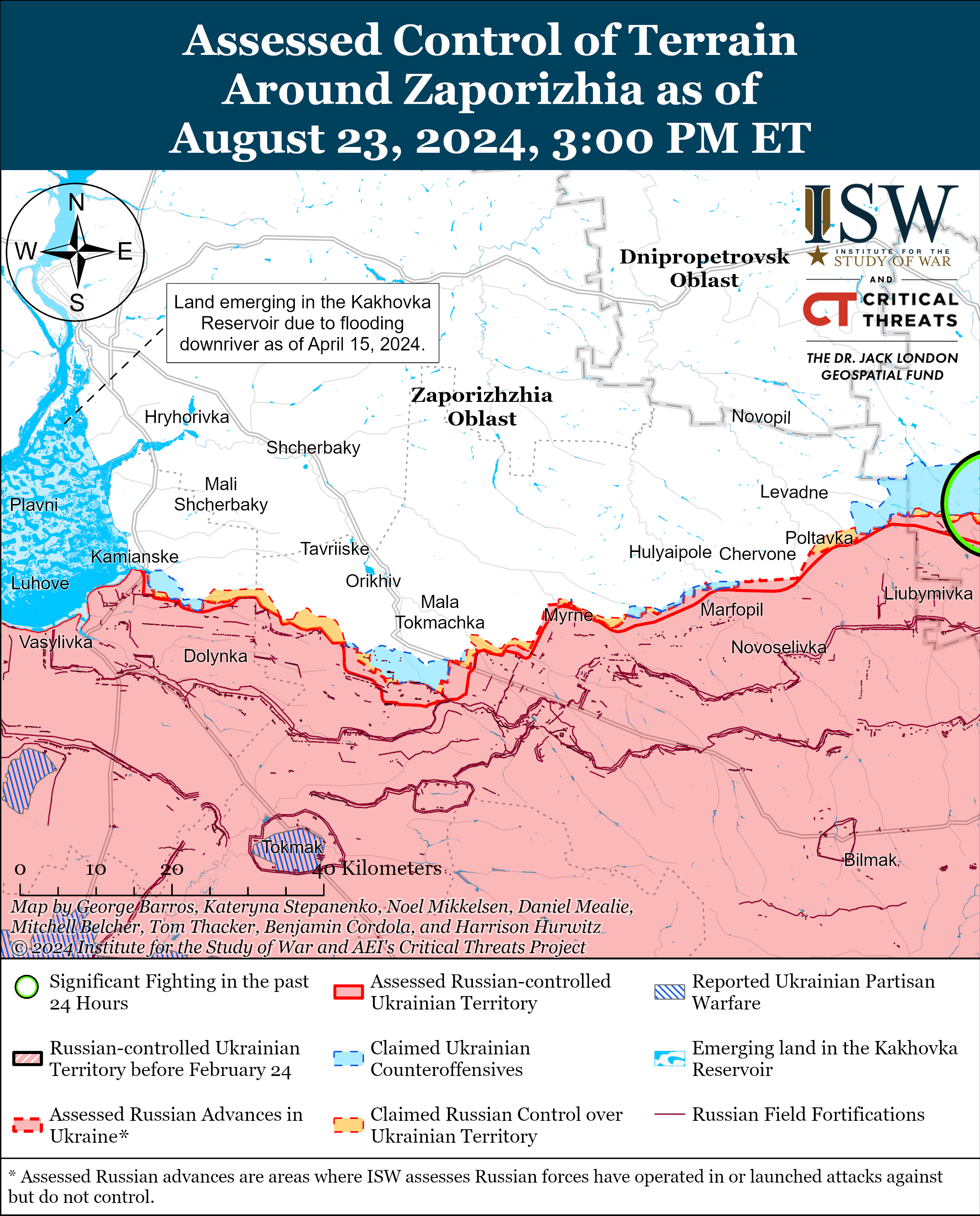Російський воєнкор 23 серпня заявив, що позиційні бої продовжуються на заході Запорізької області, проте українські джерела не повідомляли про якісь російські атаки в цьому районі.
