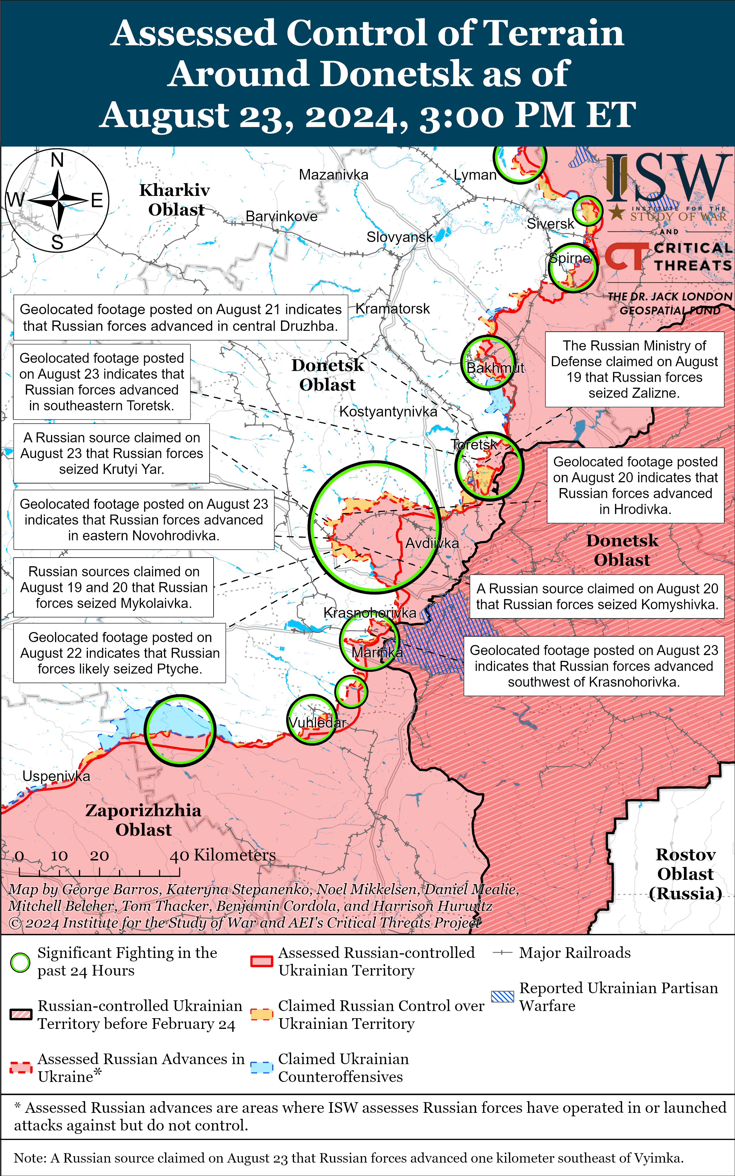 Російські війська нещодавно просунулися на захід від Донецька. Згідно з геолокаційними кадрами від 23 серпня, російські війська просунулися на південний захід від Красногорівки під час посиленого механізованого наступу чисельністю до взводу.