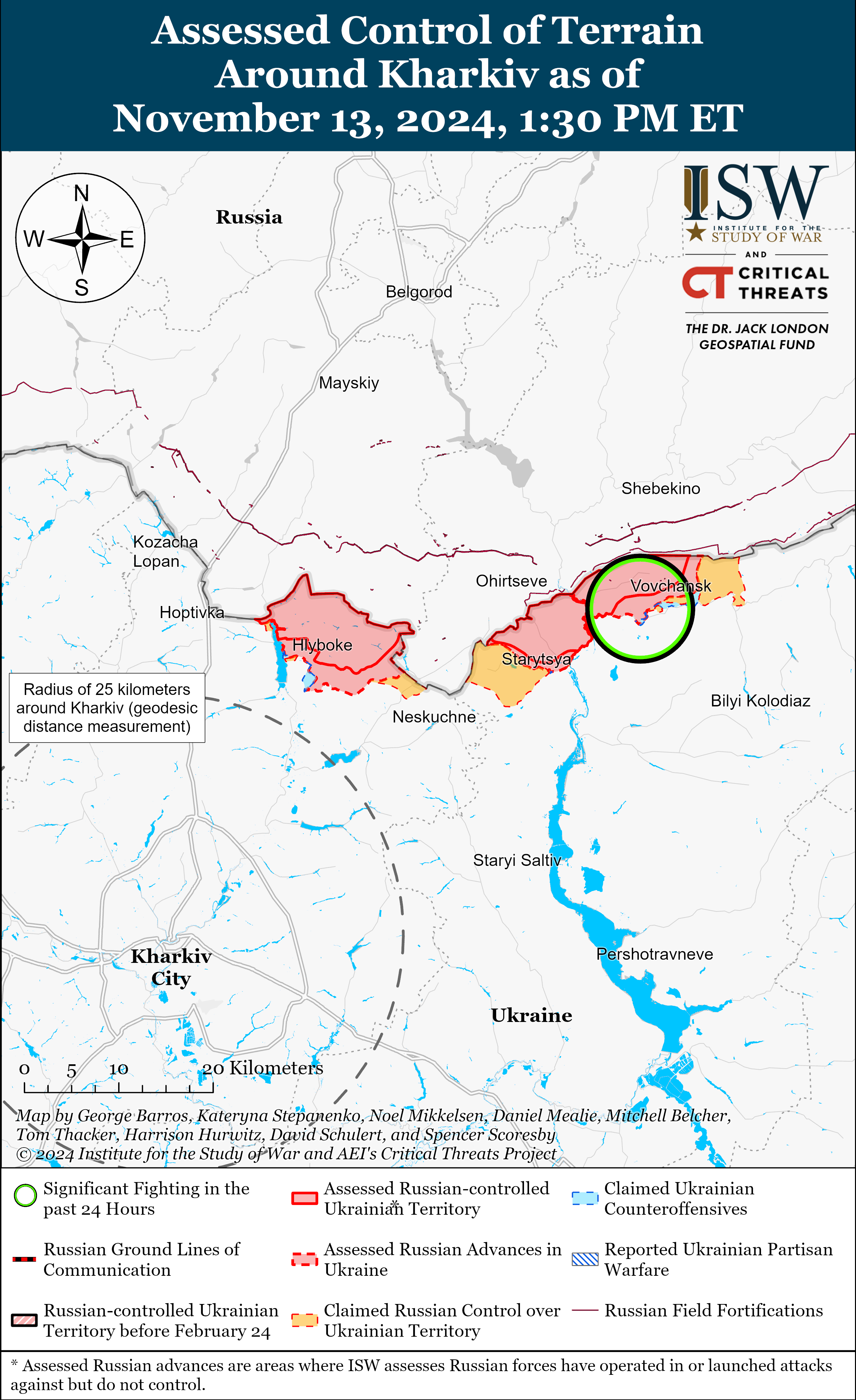 Російські загарбники продовжували наступальні дії поблизу Вовчанська Харківської області 12 і 13 листопада, але не просунулися.