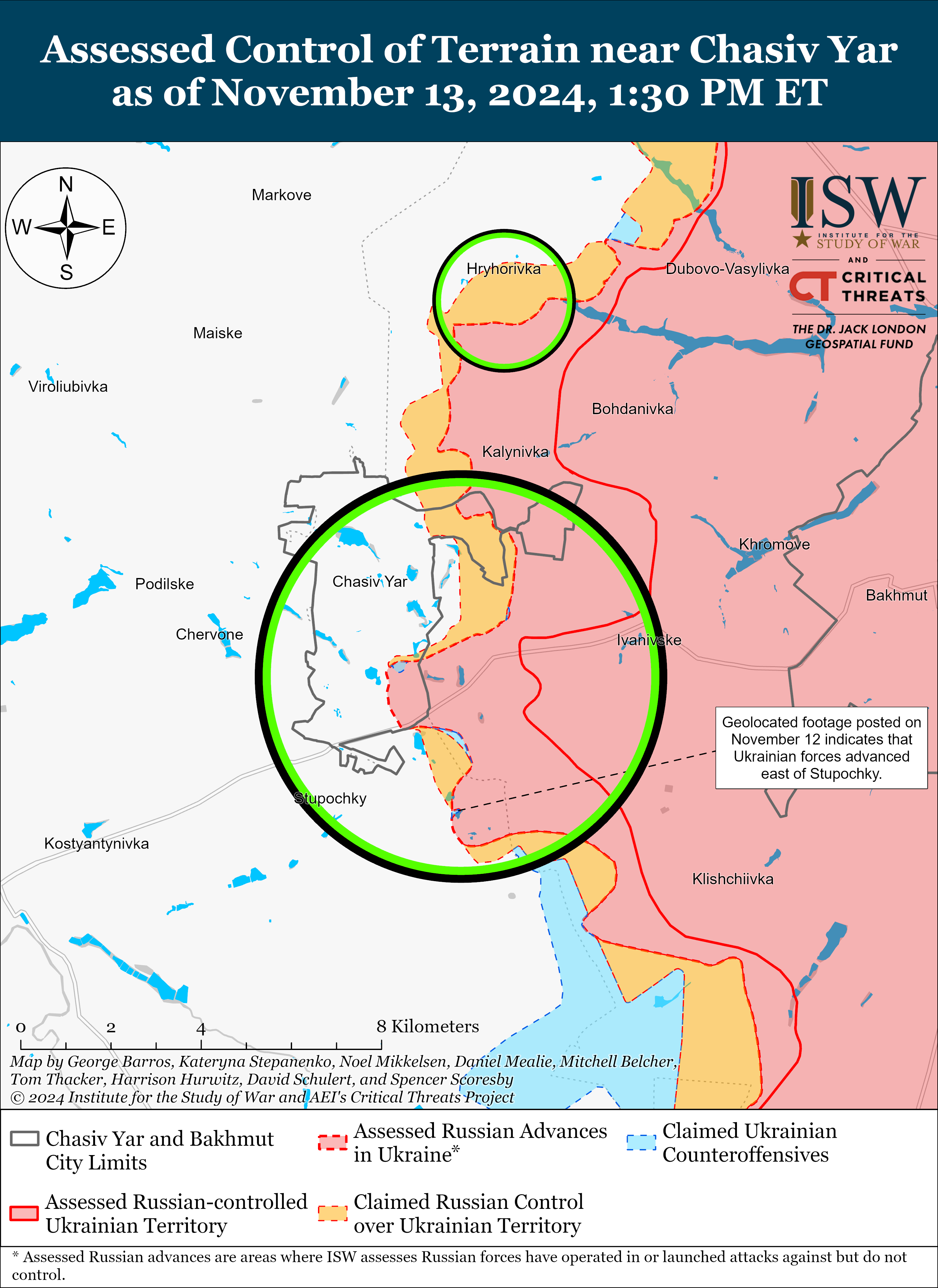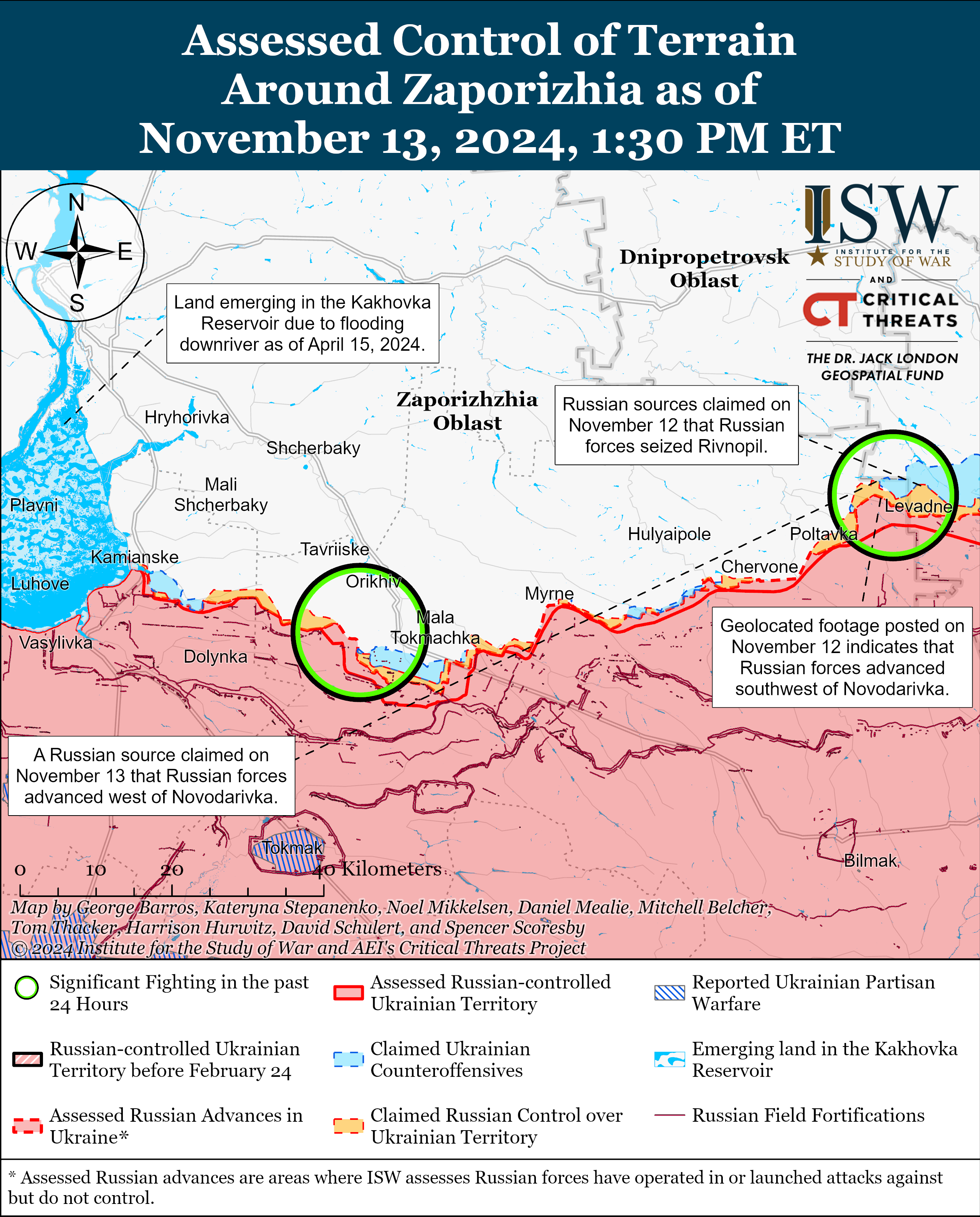 Російські джерела стверджували 12 і 13 листопада, що війська РФ просунулися в районі Новоіванівки, Зеленого Шляху та Дар'їно, біля Курилівки та Плехово, хоча в ISW не спостерігали підтвердження.