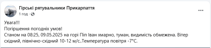 Згідно з інформацією гірських рятувальників, зранку 9 травня 2025 року (станом на 8:25) на горі Піп Іван Чорногірський зафіксували суттєве погіршення погодніх умов:
