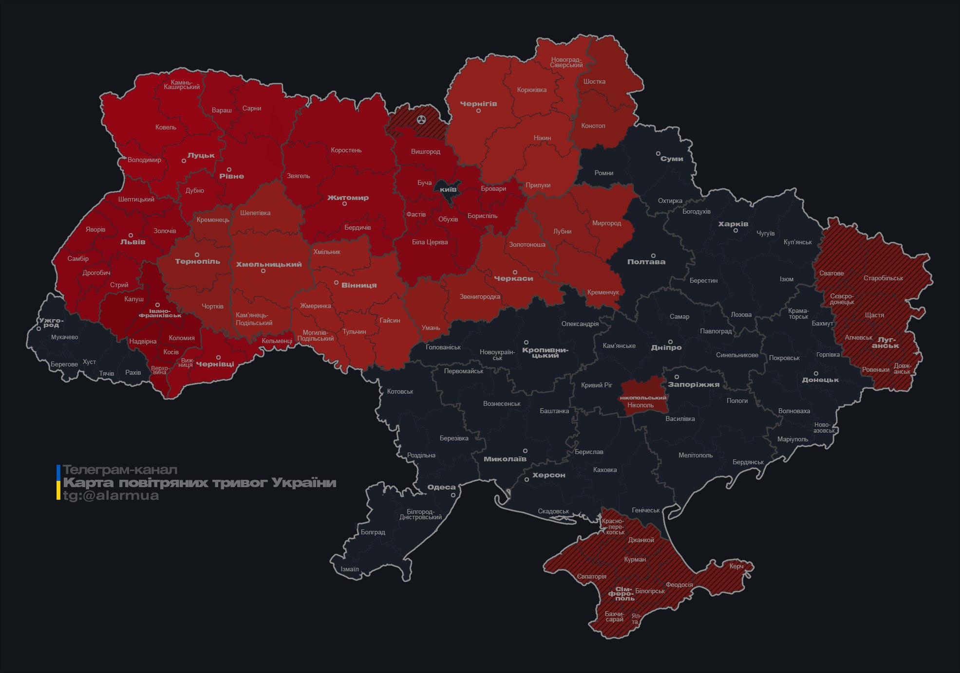 Втретє тривогу в Києві було оголошено о 22:25. На даний момент атака набула всеукраїнського масштабу.
