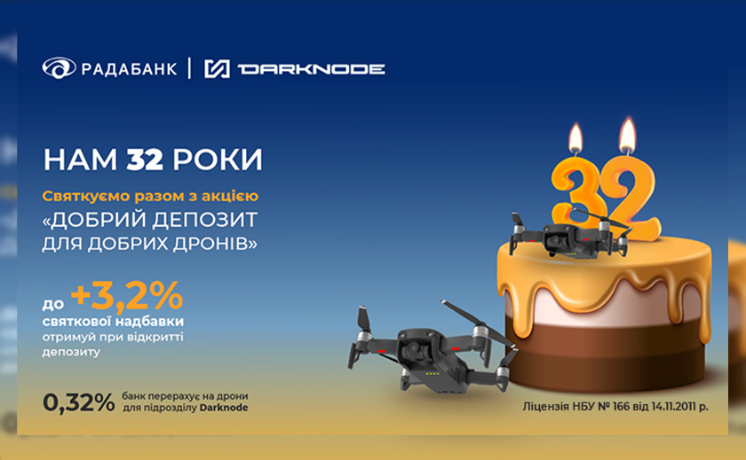 Радабанк додатково перерахує 0,32 % від суми відкритих вкладів на закупівлю дронів для підрозділу Darknode.