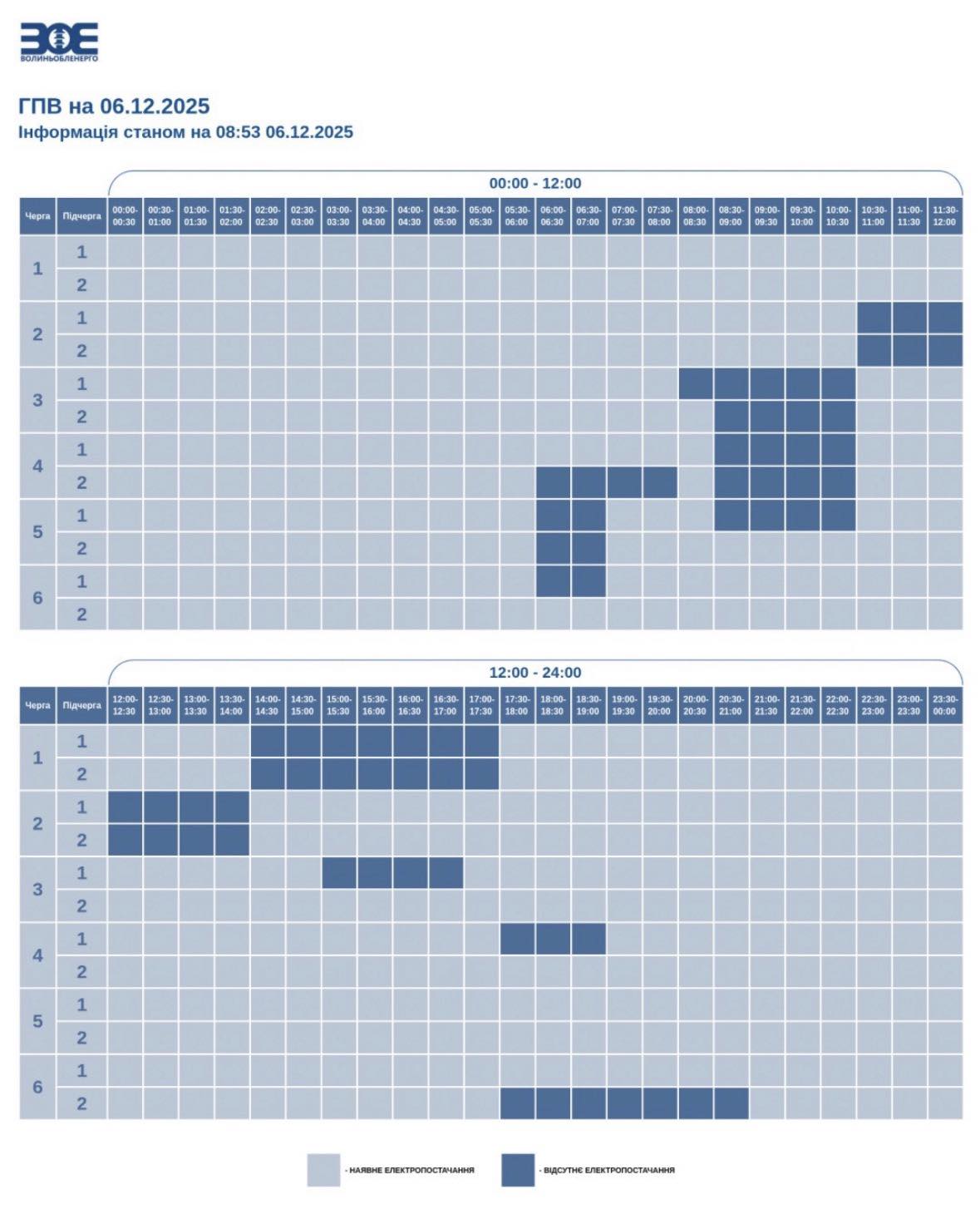 Графіки відключень на 6 грудня у Волинській області (інфографіка: energy.volyn.ua)