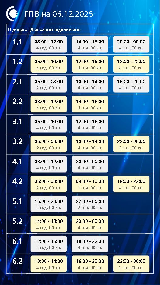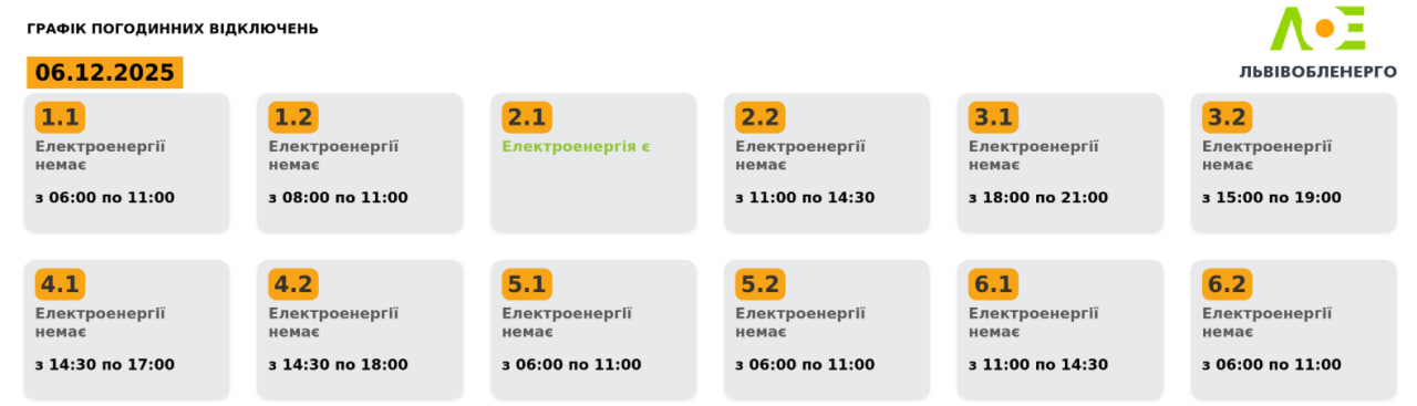 Графіки відключень на 6 грудня у Львівській області (інфографіка: poweron.loe.lviv.ua)