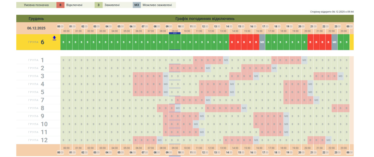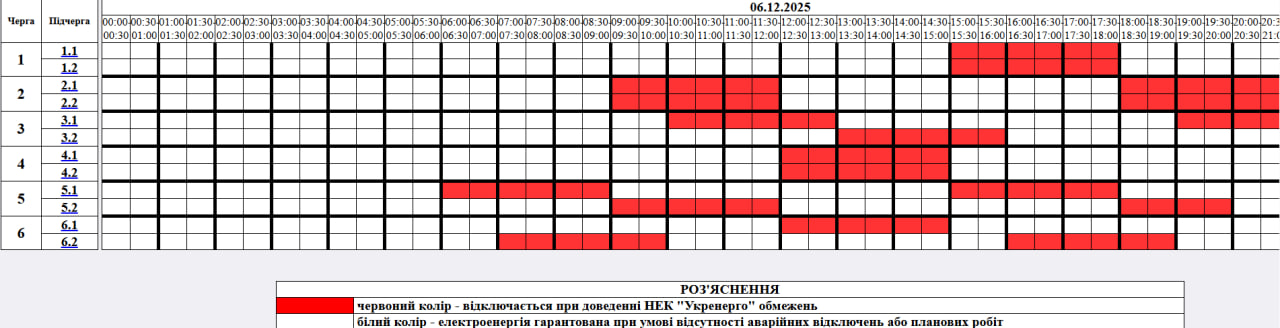 У суботу, 6 грудня, в Україні продовжать діяти графіки відключень електроенергії. Протягом доби одночасно вимикатимуть від 0,5 до 2,5 черг споживачів.