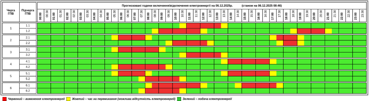 Згідно з даними АТ "Полтаваобленерго", у зв'язку зі складною ситуацією в енергосистемі України, 6 грудня 2025 року в області: