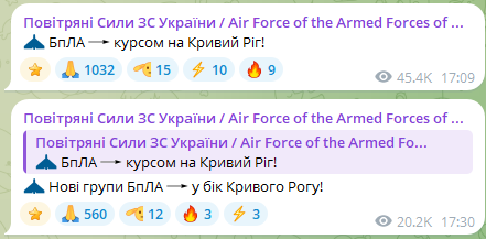 Близько 16:59 ПС ЗСУ підтвердили, що ціль спрямована на Кривий Ріг, і закликали мешканців залишатися в укриттях та суворо дотримуватися сигналів повітряної тривоги.