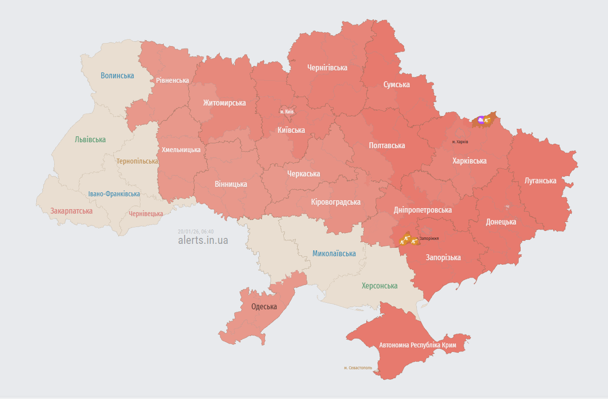 Мапа повітряних тривог зараз має такий вигляд:
